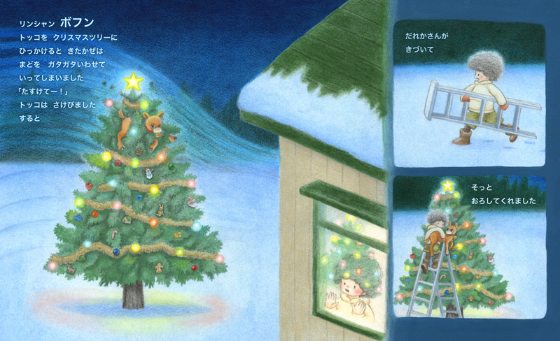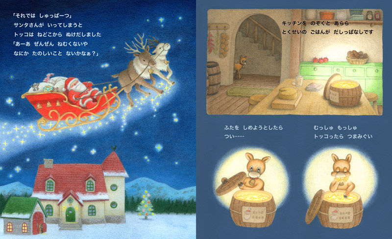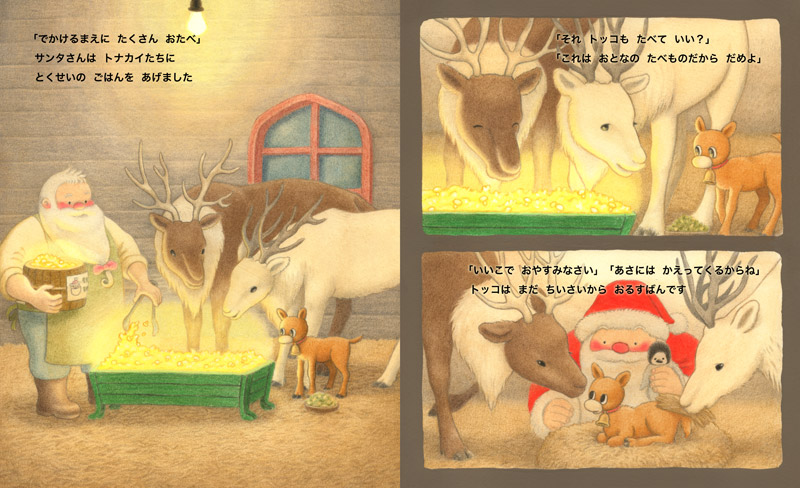 クリスマスの夜、トナカイの子トッコはサンタさんのおうちでお留守番。まだ眠たくないので遊ぶことにしたらハプニングにあっちゃって……⁉️ さびしかったトナカイの子のちょっと素敵なクリスマスの夜。